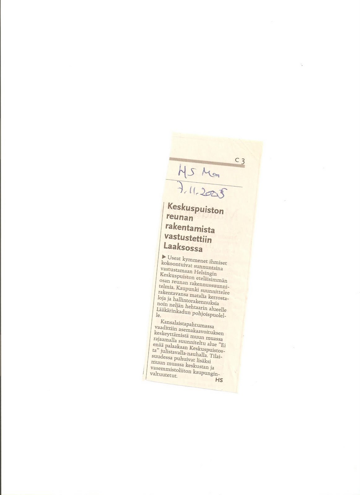 rakentamiseksi Laakson alueelle Keskuspuistoon. Kaupungin viranomaiset ovat saaneet asiasta epävirallisen tiedon” (Helsingin Sanomat 16.1.).
